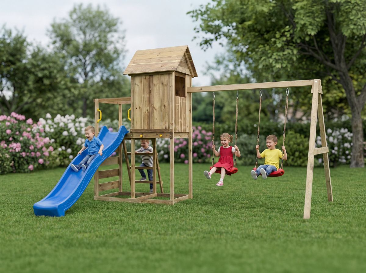 Maxplay s'adapte à vos envies : une balançoire double, une balançoire avec toboggan et tour de jeux, ou une aire de jeux complète avec maisonnette, tour de jeux, toboggan et balançoire. Les tours, modules, toboggans et accessoires Maxplay sont exclusivement destinés à la construction d'aires de jeux privées, non commerciales et non publiques, en extérieur, à l'écart des bâtiments et autres constructions. Les aires de jeux construites avec les kits et accessoires Maxplay sont conformes à la norme de sécurité européenne EN-71 relative aux équipements d'aires de jeux domestiques. Ce produit est proposé à prix réduit.